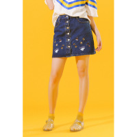 蜜妃儿夏装新款女韩版潮绣花高腰a字裙单排扣牛仔半身裙短裙