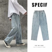 秋季新款阔腿牛仔裤男直筒宽松韩版港风潮流ins帅气抽绳休闲长裤
