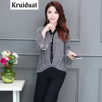 Kruidvat雪纺条纹阔腿裤时尚两件套2017夏季新款韩版大码女装气质显瘦套装黑色