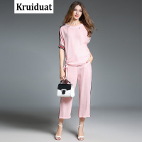 Kruidvat欧美大码女装2017夏季新款织带边上衣+九分阔腿裤休闲套装ZY粉色