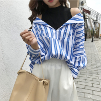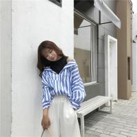 港味复古显瘦百搭条纹假两件上衣秋气质背后拉链学生打底衬衫潮女