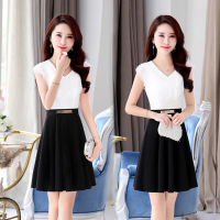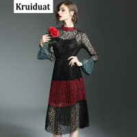 Kruidvat2017春季女装新款喇叭袖拼接收腰镂空蕾丝连衣裙压褶撞色大摆裙B076图片
