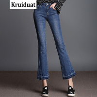 Kruidvat2017春夏弹力大码拼接撞色毛边喇叭九分裤子N011KS3019蓝色
