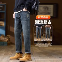 YANXU美式黄泥染复古弹力牛仔裤男养成系男友直筒阔腿裤青少年宽松长裤