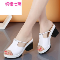 锦铭七玥2018夏季粗跟真皮防水台凉拖女时尚外穿厚底松糕拖鞋室外凉鞋