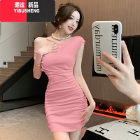 YIBUSHENG2024季新款洋气时尚修身显瘦低胸一字领露肩性感褶皱包臀连衣裙