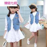 锦铭七玥2017学院童套装新女童秋装中大儿童牛仔马甲连衣裙两件套童装代发