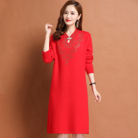 加厚新中式国风改良旗袍包臀长裙子女春秋大码收腰针织打底羊绒连衣裙红色旗袍裙气质长款复古高级感敬酒服连衣裙