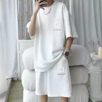 华夫格短袖套装男士港风宽松大码时尚潮流小熊印花五分袖