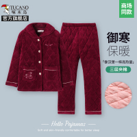 啄木鸟三层夹棉睡衣女2024冬加厚中老年家居服男法兰绒大码两件套