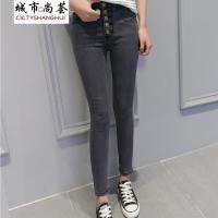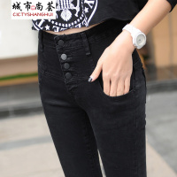 春秋季修身小脚牛仔裤男美式街头黑色侧排扣开叉破洞裤子休闲男装