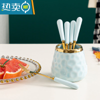 敬平创意可爱不锈钢水果叉套装家用甜品叉陶瓷收纳罐儿童叉子月饼叉子 浅蓝色收纳4叉+2勺+304挖球牙签