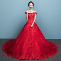 一字肩婚纱礼服红色2017冬季新款长拖尾新娘结婚韩版公主修身