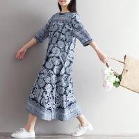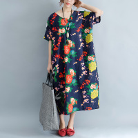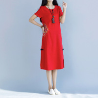 棉麻连衣裙夏中长款民族风女装袍子复古盘扣印花宽松大码文艺裙子