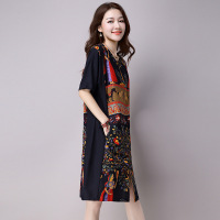 民族风2016夏季新款女装宽松印花棉麻拼接大码短袖中长款连衣裙潮