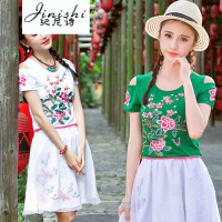 纪尼诗2017女装新款款民族风绣花时尚漏肩短款百搭纯棉T恤女大码