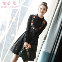 佐丹曼中国风女装连衣裙2017秋冬新款名媛气质显瘦民族风刺绣a字裙打底黑色