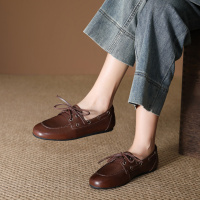 头层牛皮单鞋女春季新款复古平跟百搭豆豆小皮鞋休闲妈妈鞋