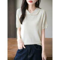 轻奢冰丝娃娃领针织短袖T恤女25夏季新款纯色薄款百搭五分袖上衣