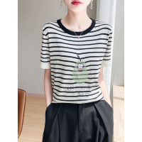 冰丝撞色条纹鸭梨印花圆领针织短袖T恤女夏季韩版薄款五分袖上衣