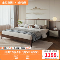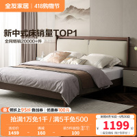 全友家居新中式舒适软包床屏橡胶木实木脚板木床卧室家具双人床
