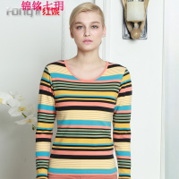 锦铭七玥红妮秋冬新款简约女士弹力莱卡棉圆领舒绒提花条纹薄秋衣秋裤套装