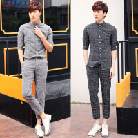 丹杰仕 夏款男士韩版时尚格子中袖衬衣套装男青少年时尚休闲中袖衬衫套装男装潮 TZ16小咖秀百搭潮4466