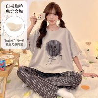 2026春夏季棉质套头短袖长裤带胸垫女士睡衣卡通休闲可外穿家居服