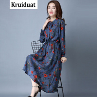 Kruidvat2017春夏女式连衣裙文艺风系带领雪纺印花长裙收腰显瘦女裙Z008蓝色均码