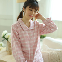 娉语高档女士秋冬季彩棉加厚中空纱长袖睡衣简约格子日系家居服套装