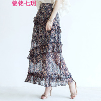 锦铭七玥2018春季新款高腰碎花立体荷叶边A字裙 韩版百搭雪纺长裙半身裙潮