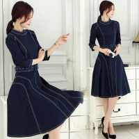 莞馨(wanxin)新款2016秋季新款韩版女装七分袖圆领中腰修身显瘦百搭纯色a字连衣裙