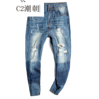 C2潮朝快手网红天佑日系男装牛仔裤男春夏新款九分裤港风原创英伦大码破洞牛仔裤韩版精神小伙大