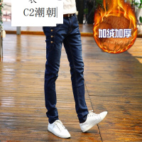 C2潮朝快手红人高迪天佑冬季加绒加厚牛仔裤加大码保暖猫须点缀牛仔裤港仔文艺男百搭款深蓝色