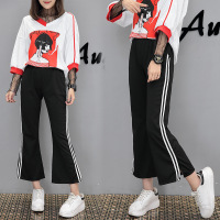 薇侣2017新品秋季新款女裤子高腰裤阔腿裤两条杠宽松长裤休闲运动裤
