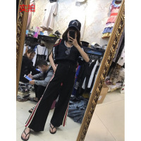 薇侣2017新品时尚后背系带上衣+杠条休闲长裤套装