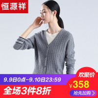 恒源祥纯羊毛衫女装开衫秋冬绞花彩色配边针织外套复古单排扣毛衣