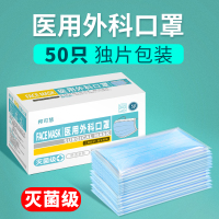 50片蓝色灭菌型医用外科口罩一次性医疗口罩三层医护医生专用单片包装独立包装 细菌过滤率大于95%医用外科口罩50片/盒