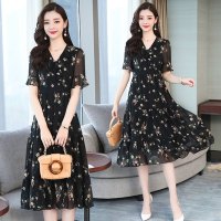 魅言魅语(MeiYanMeiYu)黑色雪纺连衣裙2021夏季新款韩版女装短袖中长款印花碎花连衣裙
