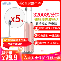 worms电动牙刷成人情侣款声波美白全自动硅胶防水软毛刷 莫兰粉 五档位豪华充电款配(原装5刷头+USB充电线)