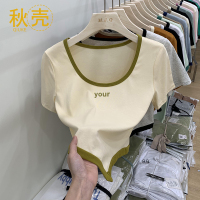 秋壳不规则设计感T恤女短袖夏季学生露锁骨短款方领上衣2022新款