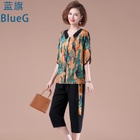 蓝旗 上衣+裤子妈妈中年女短袖2021新款夏宽松两件套套装