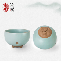 东道 汝窑吉福单杯 猪年汝窑茶杯陶瓷主人杯 景德镇汝瓷功夫茶具杯 冰裂釉 吉福单杯