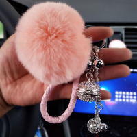 韩国创意钥匙扣女 真兔毛 獭兔毛球毛绒挂件汽车钥匙环女生包挂件 浅粉绳圆宫铃韩粉毛球 抖音