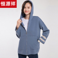 恒源祥休闲连帽针织衫女条纹秋冬宽松拉链毛衣外套侧开叉纯羊毛衫