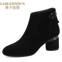 莱卡金顿 冬季靴子女高跟圆头短筒靴韩版百搭绒面时尚粗跟复古短靴 6564