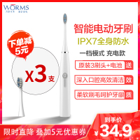 worms电动牙刷成人家用软毛超声波防水美白全自动网红款情侣牙刷 钻石白一档位充电款 配(原装3刷头+USB线)