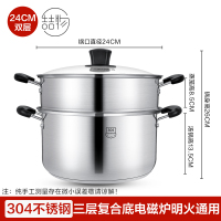 美的喆物蒸锅家用304不锈钢加厚锅双多3三层电磁炉燃气灶多功能大蒸笼 *[玻璃盖-304不锈钢/24cm] 26cm