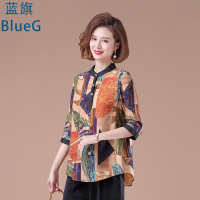 蓝旗夏季新款妈妈装七分袖T恤印花上衣宽松遮肚中老年洋气小衫