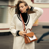 撞色牛皮凯莉包女2019时尚潮款宽带手提斜挎包